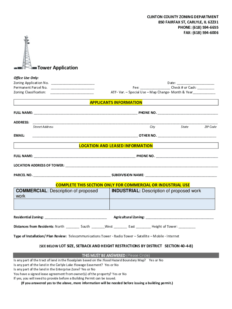 CLINTON COUNTY ZONING DEPARTMENT 850 FAIRFAX ST, CARLYLE, IL 62231 PHONE: (618) 5946655 FAX: (618) 5946006Tower Application Office Use Only: Zoning Application No. ___ Permanent Parcel No. ___ Zoning