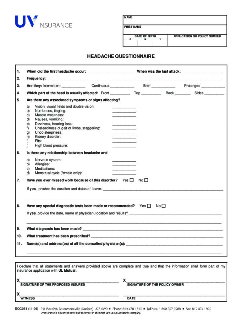 NAME FIRST NAME DATE OF BIRTH APPLICATION OR POLICY NUMBER HEADACHE QUESTIONNAIRE 1. When did the first headache occur: ___ When was the last attack: ___2. Frequency: ___3. Are they: Intermittent