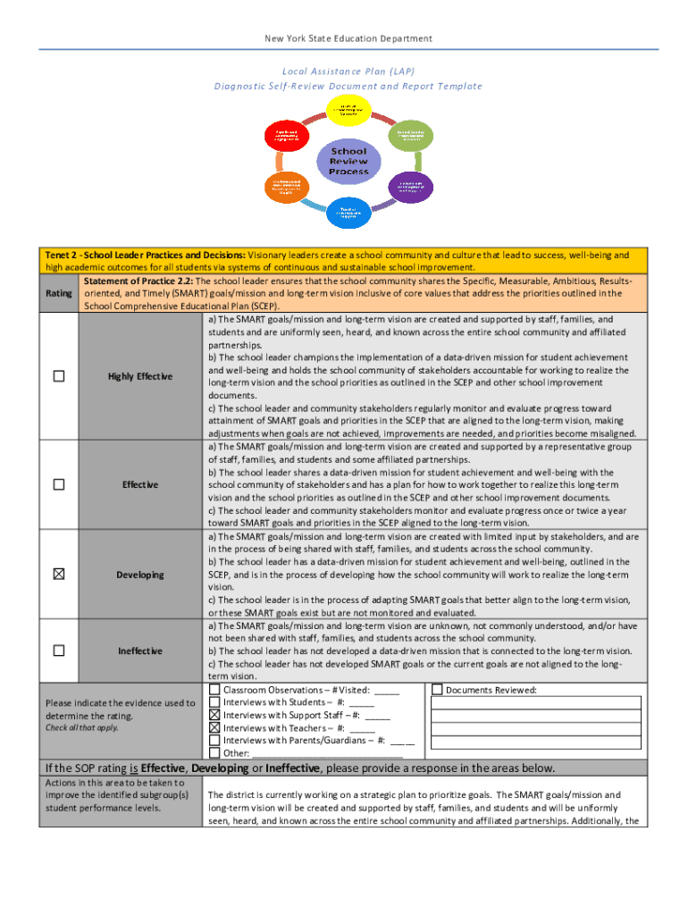 New York State Education Department Local Assistance Plan (LAP) Diagnostic Teleview Document and Report Temple tenet 2 School Leader Practices and Decisions: Visionary leaders create a school community