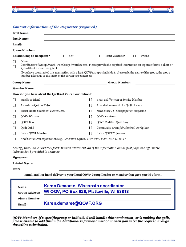 Nomination Form Nomination of a Service Member or Living Veteran who has been Touched by War for a Quilt of Valor Before completing this nomination form for a Quilt of Valor (NOV), please read the