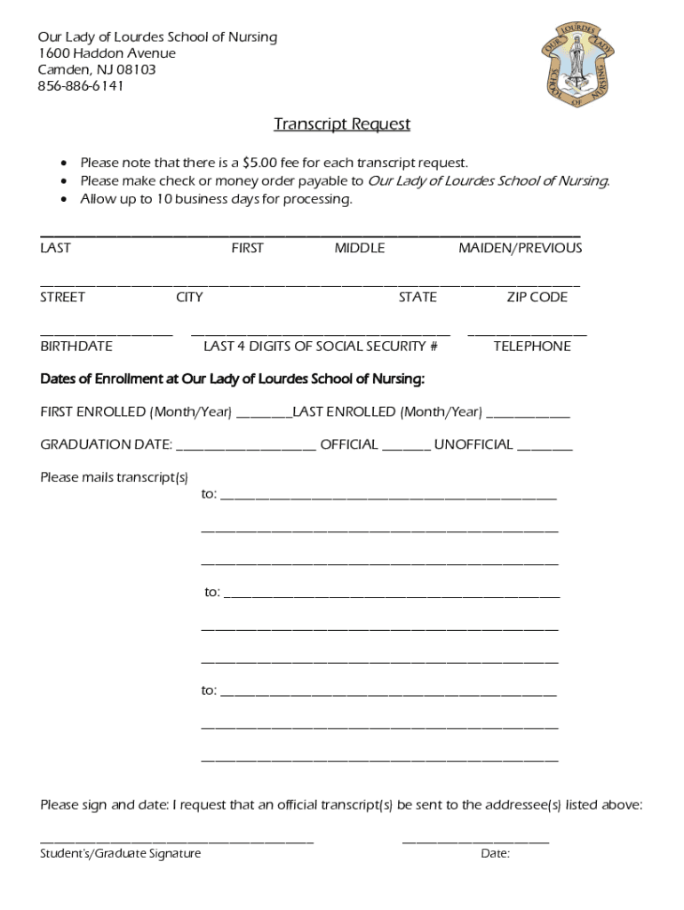 Our Lady of Lourdes School of Nursing 1600 Had done Avenue Camden, NJ 08103 8568866141Transcript Request Please note that there is a $5.00 fee for each transcript request. Please make check or money