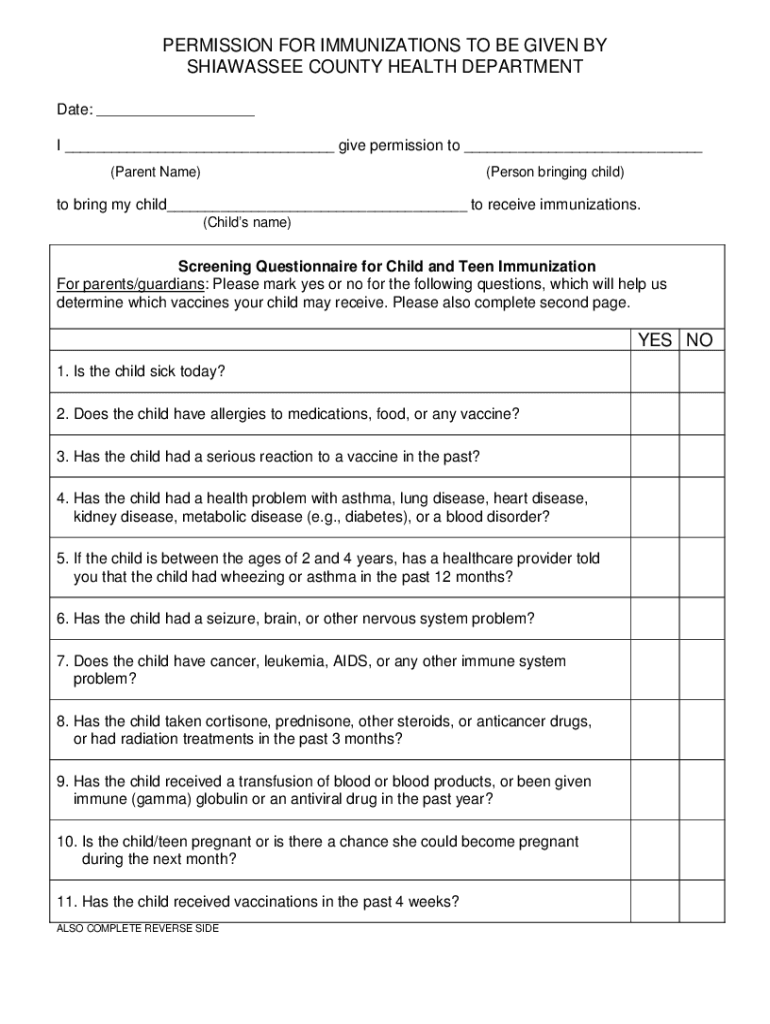 PERMISSION FOR IMMUNIZATIONS TO BE GIVEN BY SHIAWASSEE COUNTY HEALTH DEPARTMENT Date: ___ I ___ give permission to ___ (Parent Name)(Person bringing child)to bring my child___ to receive immunizations.