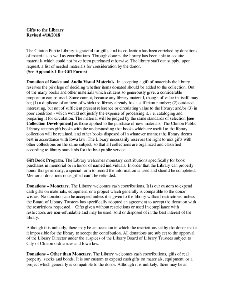 Gifts to the Library Revised 4/10/2018The Clinton Public Library is grateful for gifts, and its collection has been enriched by donations of materials as well as contributions. Through donors, the