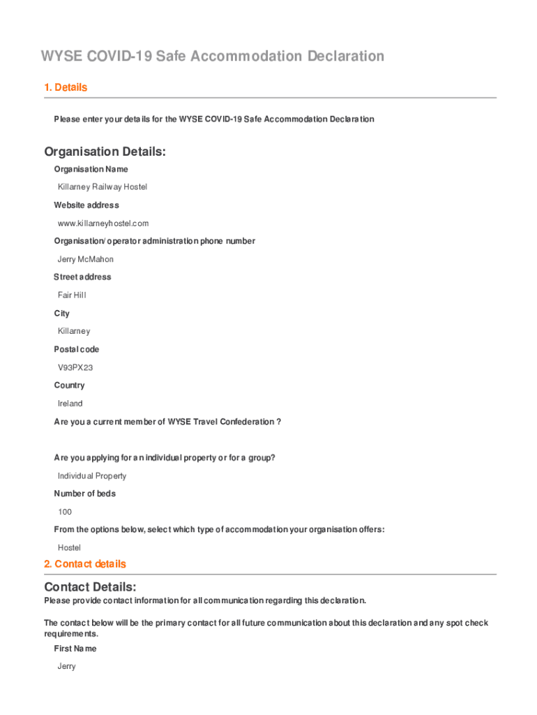 WISE COVID-19 Safe Accommodation Declaration 1. Details Please enter your details for the WISE COVID-19 Safe Accommodation DeclarationOrganisation Details: Organization Name Hillary Railway Hostel