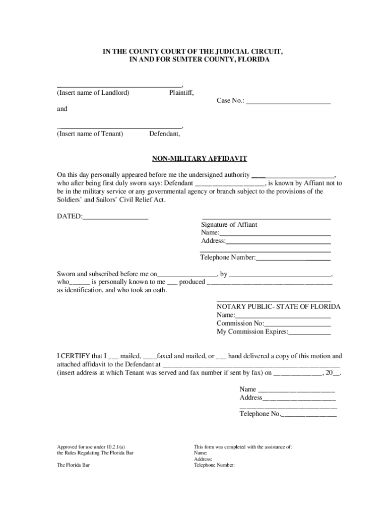 IN THE COUNTY COURT OF THE JUDICIAL CIRCUIT, IN AND FOR SUMTER COUNTY, FLORIDA_ (Insert name of Landlord), Plaintiff, Case No.:and _ (Insert name of Tenant), Defendant, NONMILITARY AFFIDAVIT On this