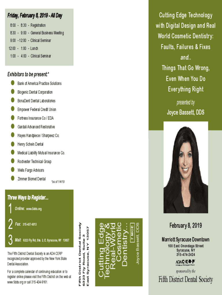 Cutting Edge Technology Friday, February 8, 2019, All Day with Digital Design and Real8:00 8:30 Registration 8:30 9:00 General Business MeetingWorld Cosmetic Dentistry:9:00 12:00 Clinical SeminarFaults,