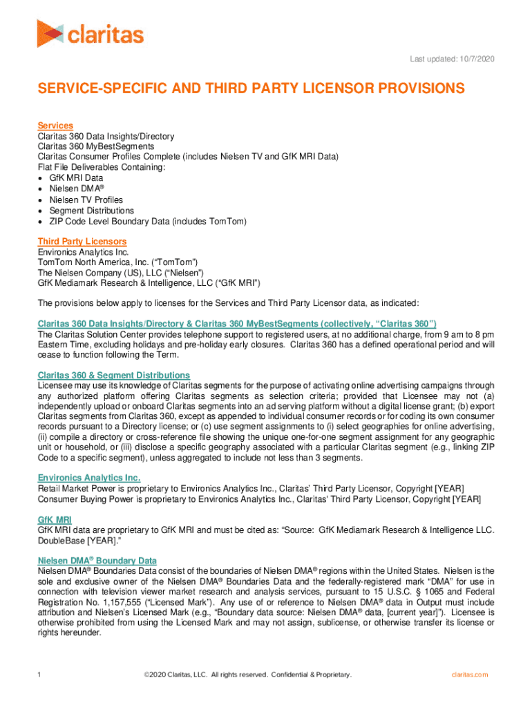 Last updated: 10/7/2020SERVICESPECIFIC AND THIRD PARTY LICENSOR PROVISIONS Services Clarity 360 Data Insights/Directory Clarity 360 MyBestSegments Clarity Consumer Profiles Complete (includes Nielsen