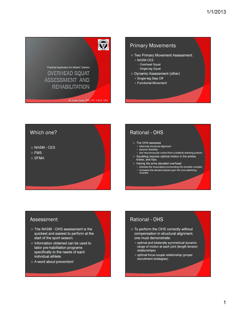 1/1/2013Primary Movements Two Primary Movement Assessment: NAMES Overhead SquatPractical Application for Athletic Trainers Single leg SquatDynamic Assessment (other) Single leg Step Off Functional
