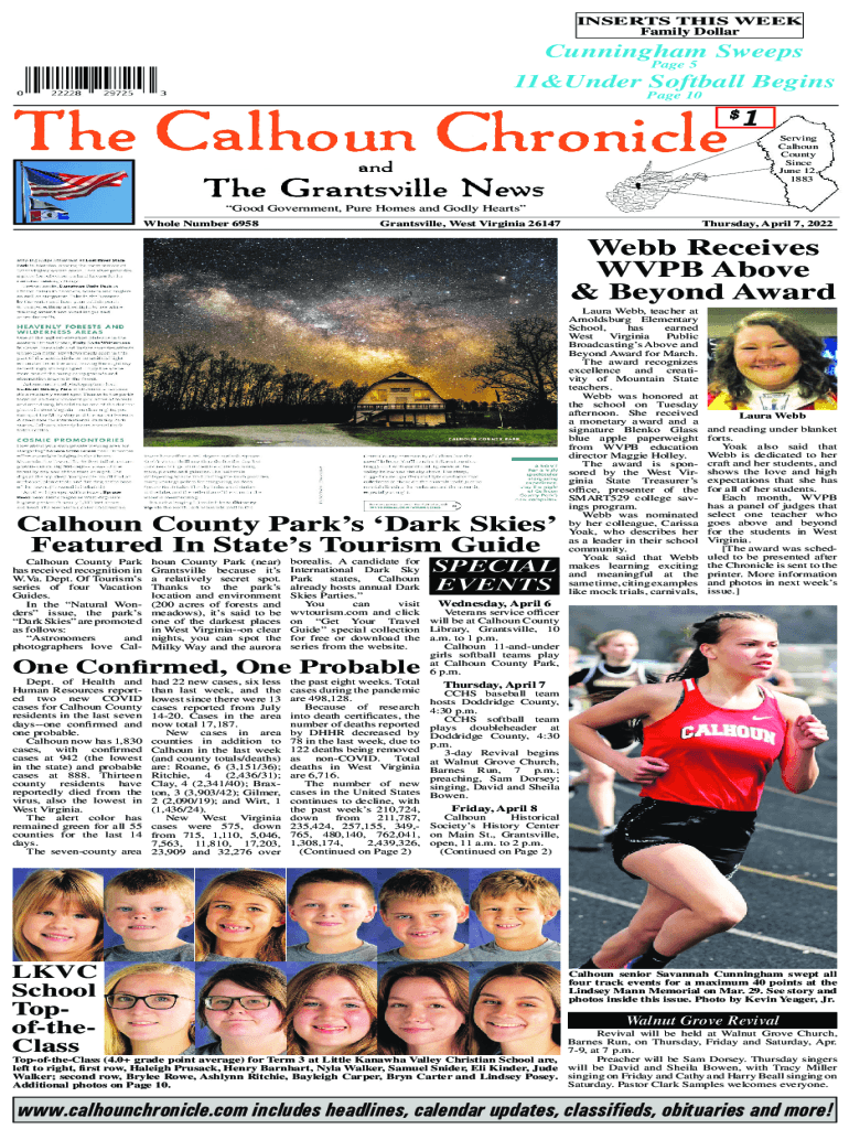 INSERTS THIS WEEK Family Dollar Cunningham Sweeps Page 511&Under Softball Begins Page $101 Serving Calhoun County Since June 12, 1883Good Government, Pure Homes and Godly Hearts Whole Number 6958Grantsville,