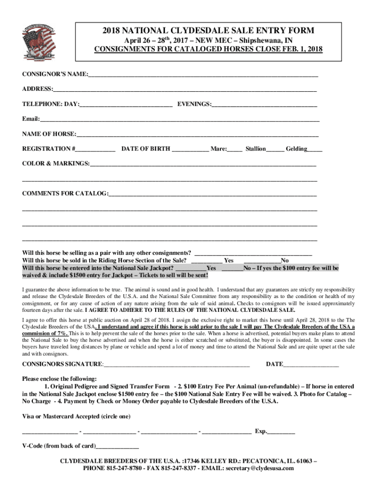 2018 NATIONAL CLYDESDALE SALE ENTRY FORM April 26 28th, 2017 NEW MEC Shipshewana, IN CONSIGNMENTS FOR CATALOGED HORSES CLOSE FEB. 1, 2018 CONSIGNORS NAME:___ ADDRESS:___ TELEPHONE: DAY:___ EVENINGS:___