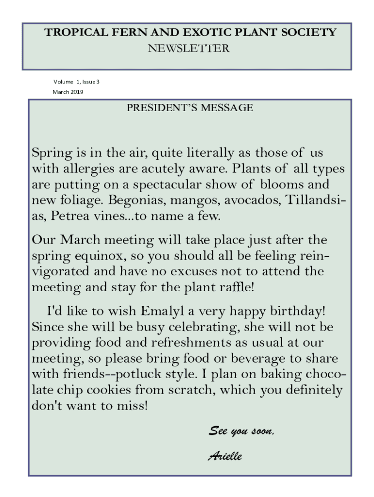 TROPICAL FERN AND EXOTIC PLANT SOCIETY NEWSLETTER Volume 1, Issue 3 March 2019PRESIDENTS MESSAGESpring is in the air, quite literally as those of us with allergies are acutely aware. Plants of all