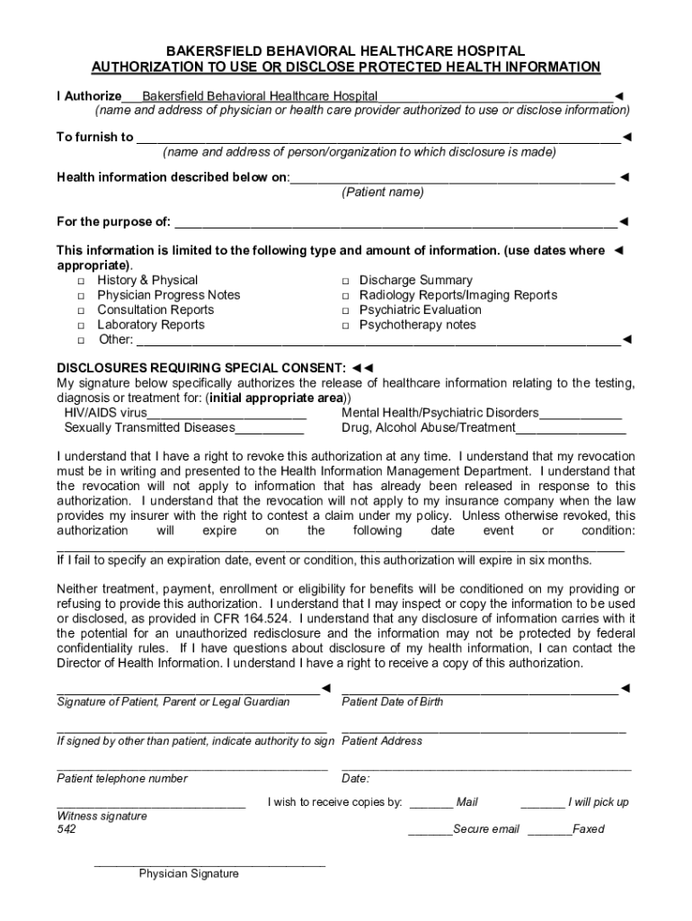 BAKERSFIELD BEHAVIORAL HEALTHCARE HOSPITAL AUTHORIZATION TO USE OR DISCLOSE PROTECTED HEALTH INFORMATION I Authorize___Bakersfield Behavioral Healthcare Hospital___ (name and address of physician