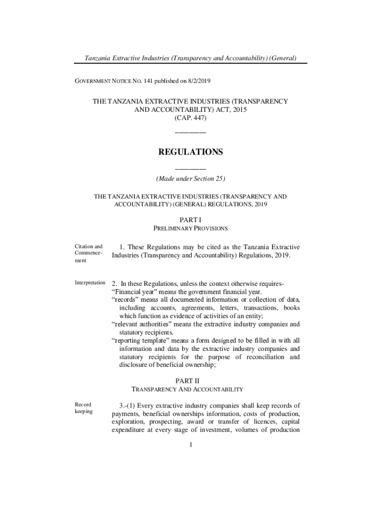 Tanzania Extractive Industries (Transparency and Accountability) (General) GN. No. 141 (contd.)GOVERNMENT NOTICE NO. 141 published on 8/2/2019THE TANZANIA EXTRACTIVE INDUSTRIES (TRANSPARENCY AND ACCOUNTABILITY)