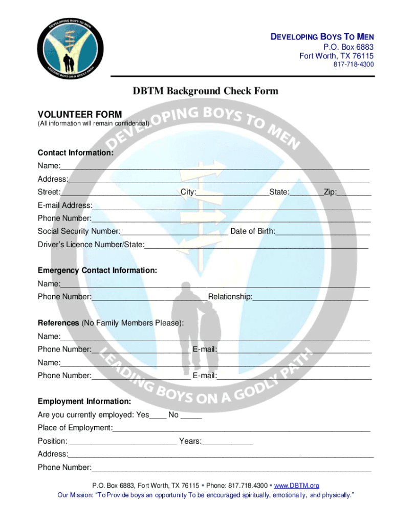 DEVELOPING BOYS TO MEN P.O. Box 6883 Fort Worth, TX 76115 8177184300DBTM Background Check Form VOLUNTEER FORM (All information will remain confidential)Contact Information: Name:___ Address:___ Street:___City:___State:___Zip:___