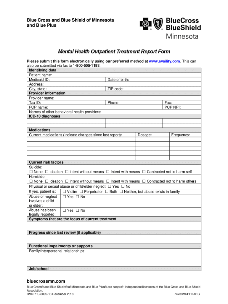 Blue Cross and Blue Shield of Minnesota and Blue Elemental Health Outpatient Treatment Report Form Please submit this form electronically using our preferred method at www.availity.com. This can also