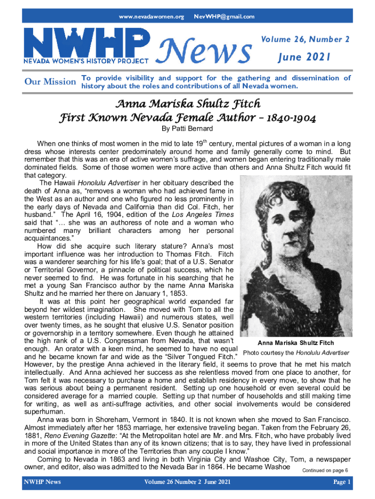 Www.nevadawomen.orgNevWHP@gmail.comVolume 26, Number 2June 2021 Our Mission provide visibility and support for the gathering and dissemination of history about the roles and contributions of all Nevada
