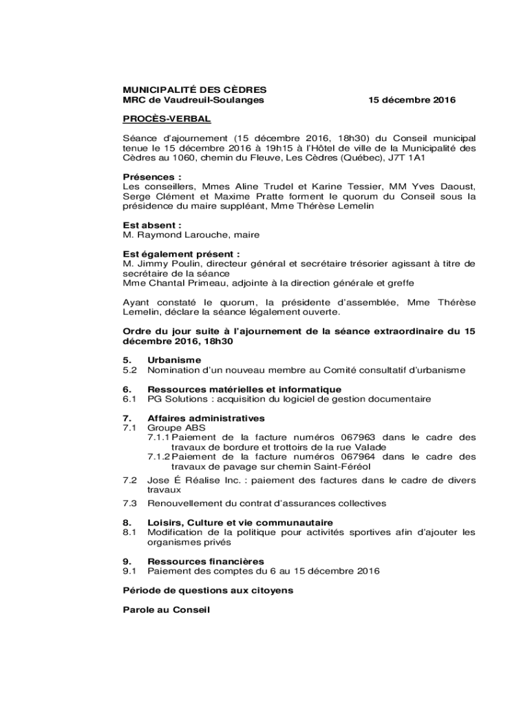 MUNICIPALITY DES CORES MRC de VaudreuilSoulanges15 December 2016PROCSVERBAL Since adjournment (15 December 2016, 18h30) Du Conrail municipal tenure LE 15 December 2016 19h15 LHTEC de Villa DE la Municipality
