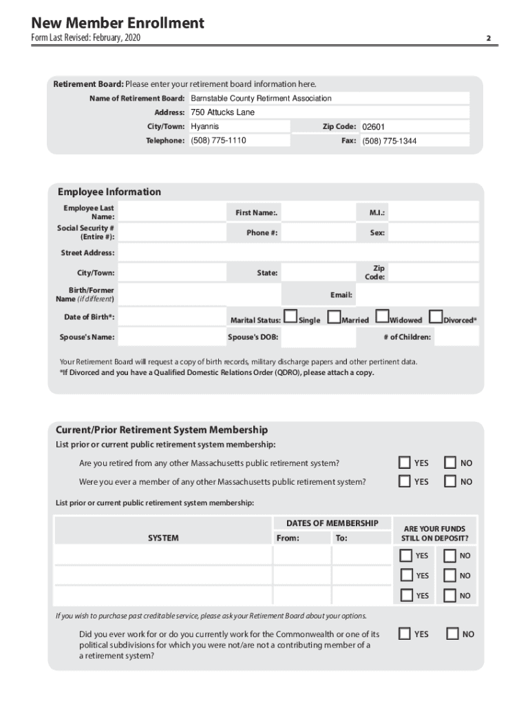 PUBLIC EMPLOYEE RETIREMENT ADMINISTRATION COMMISSION FIVE MIDDLESEX AVENUE, SUITE 304 | SOMERVILLE, MA 02145IntroductionNew Member Enrollment Form Last Revised: February, 2020The New Member Enrollment