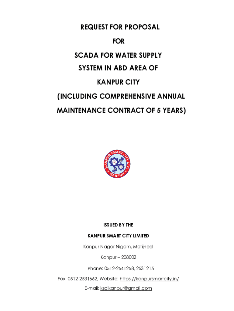 REQUEST FOR PROPOSAL FOR SCADA FOR WATER SUPPLY SYSTEM IN ABD AREA OF KANPUR CITY (INCLUDING COMPREHENSIVE ANNUAL MAINTENANCE CONTRACT OF 5 YEARS)ISSUED BY KANPUR SMART CITY LIMITED Kanpur Nagar Night,
