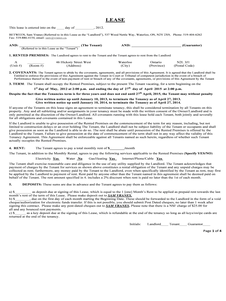 LEASE This lease is entered into on the day of, 2012. BETWEEN, Sam Cranes (Referred to in this Lease as the Landlord), 537 Wood Nettle Way, Waterloo, ON, N2V 2×9, Phone: 519-404-6262 Fax: 519-886-4154,