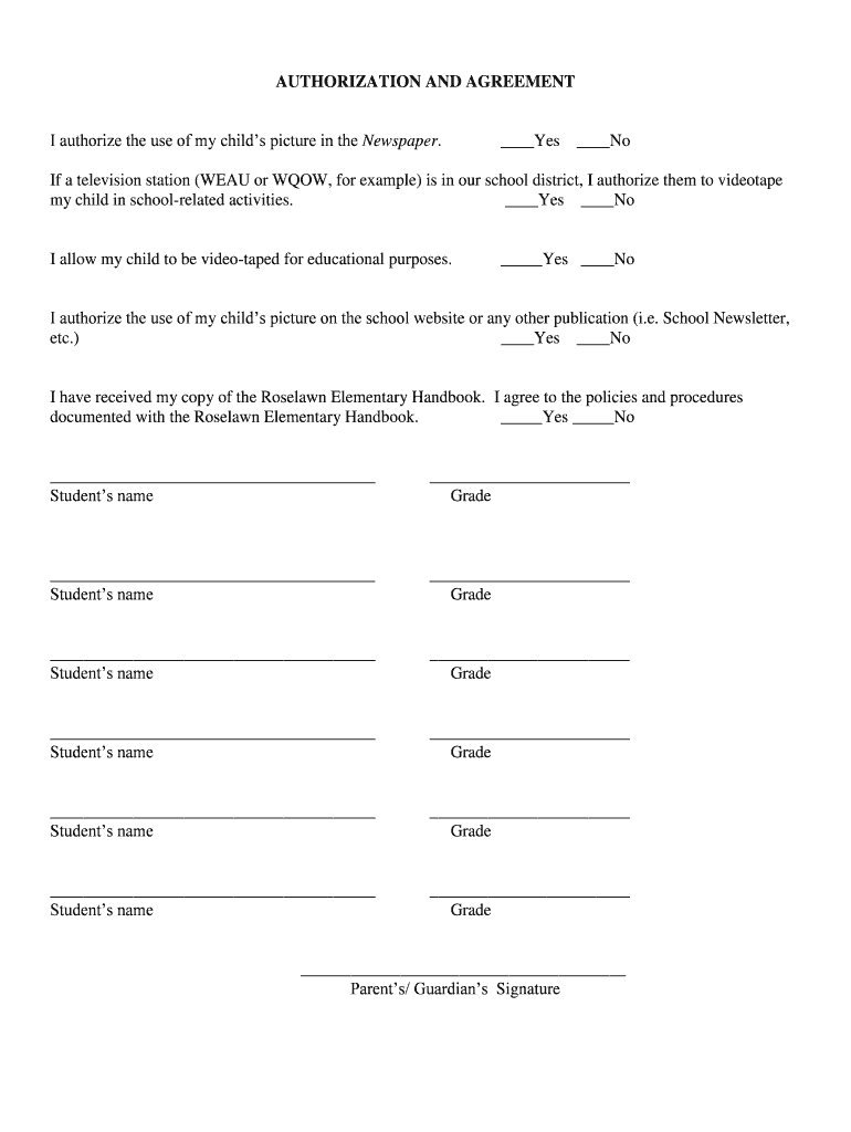 AUTHORIZATION AND AGREEMENT I authorize the use of my children picture in the Newspaper. Yes No If a television station (WEAR or WOW, for example) is in our school district, I authorize them to videotape