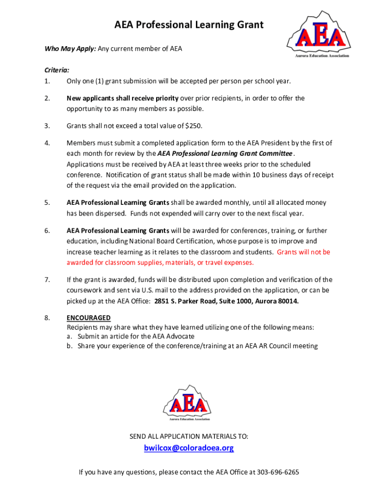 AEA Professional Learning Grant Who May Apply: Any current member of AEA Criteria: 1. Only one (1) grant submission will be accepted per person per school year. 2. New applicants shall receive priority