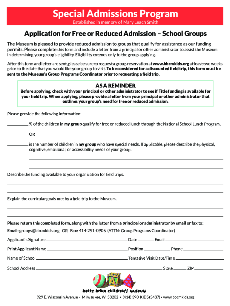 Special Admissions Program Established in memory of Mary Leach Misapplication for Free or Reduced Admission School Groups The Museum is pleased to provide reduced admission to groups that qualify