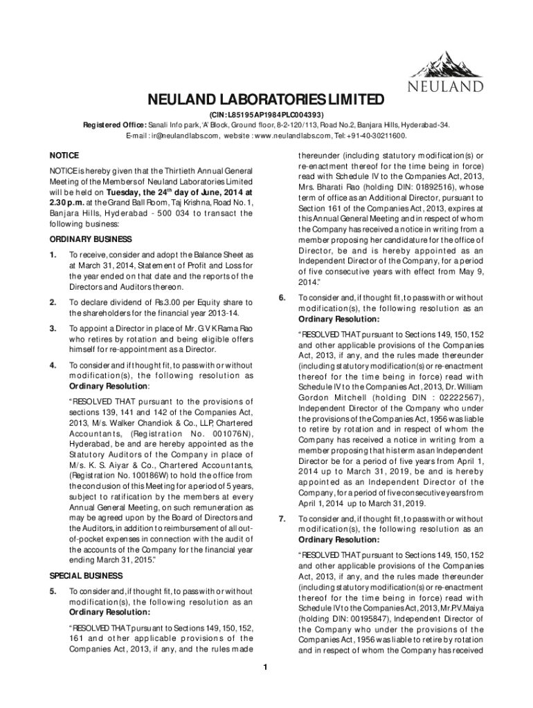 NEYLAND LABORATORIES LIMITED (IN: L85195AP1984PLC004393) Registered Office: Sonali Info park, A Block, First floor, 82120/113, Road No.2, Barbara Hills, Hyderabad34. Email : ir@neulandlabs.com, website
