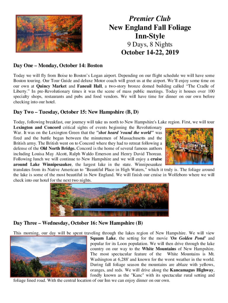 Premier Club New England Fall Foliage Style 9 Days, 8 Nights October 1422, 2019 Day One Monday, October 14: Boston Today we will fly from Boise to Bostons Logan airport. Depending on our flight schedule