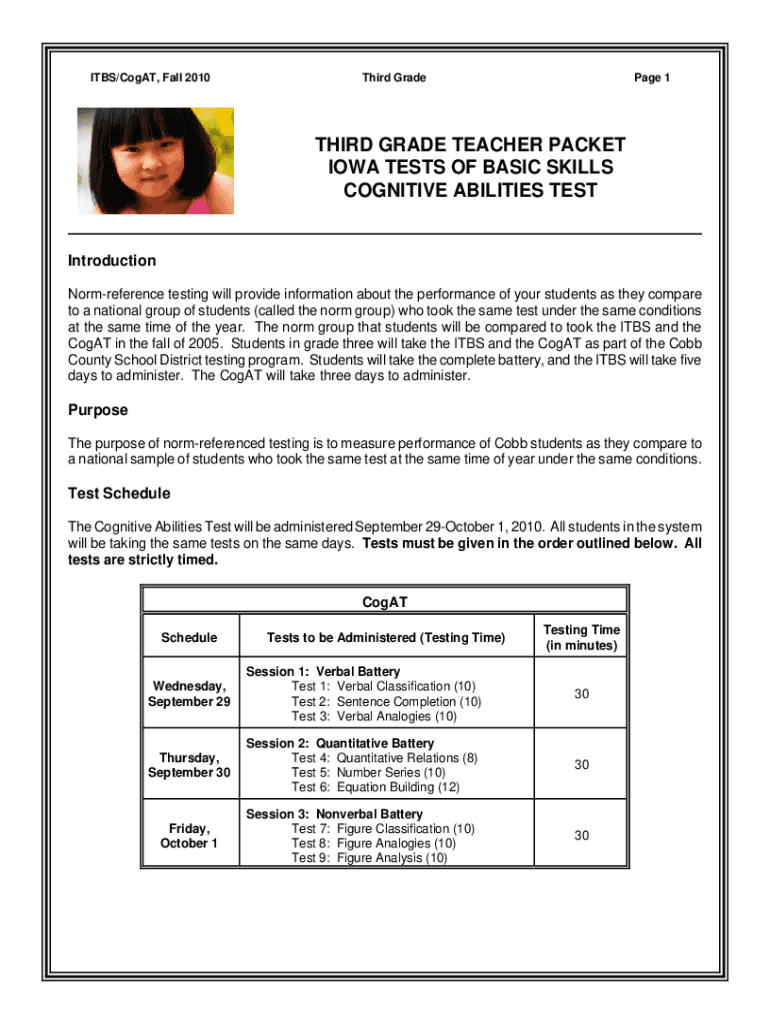 ITS/Coat, Fall 2010Third Grade Page 1THIRD GRADE TEACHER PACKET IOWA TESTS OF BASIC SKILLS COGNITIVE ABILITIES Reintroduction Norm reference testing will provide information about the performance