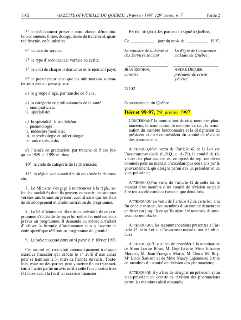 1102GAZETTE OFFICIALLY DU QUEBEC, 19 frier 1997, 129 e Anne, no 75 LE medicament prescript: not, class, nomination commune, form, dosage, due Du treatment, quantity Fournier, cot universe; 6 la date