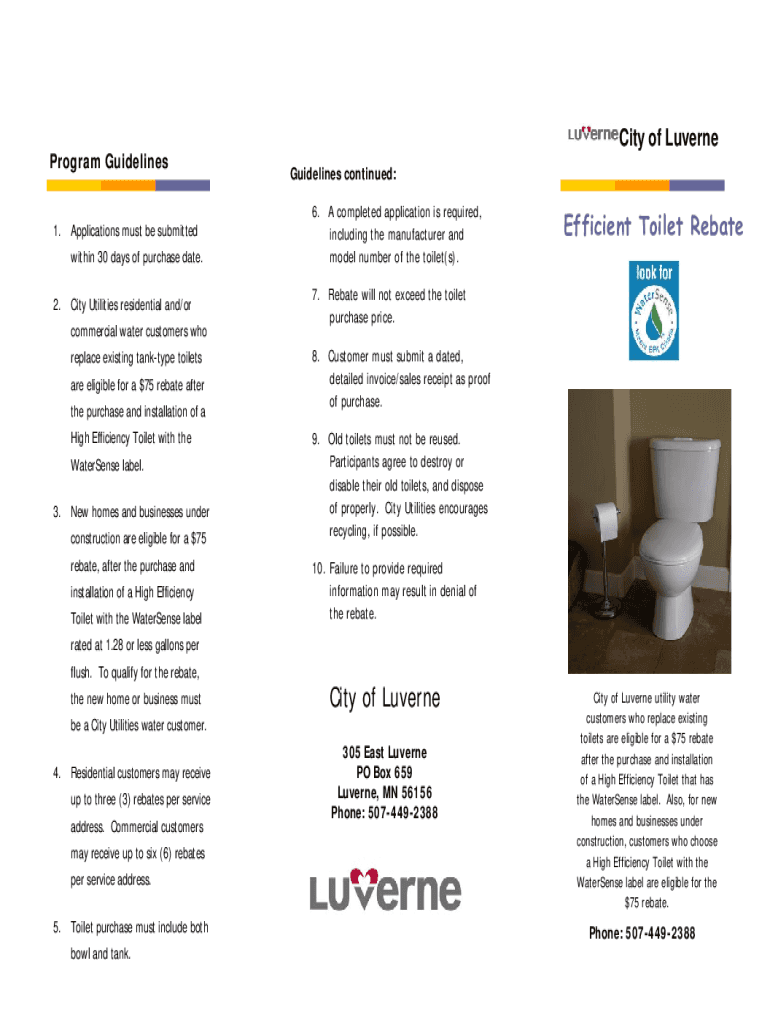 Program Guidelines 1. Applications must be submitted within 30 days of purchase date. 2. City Utilities residential and/or commercial water customers who replace existing tank type toilets are eligible