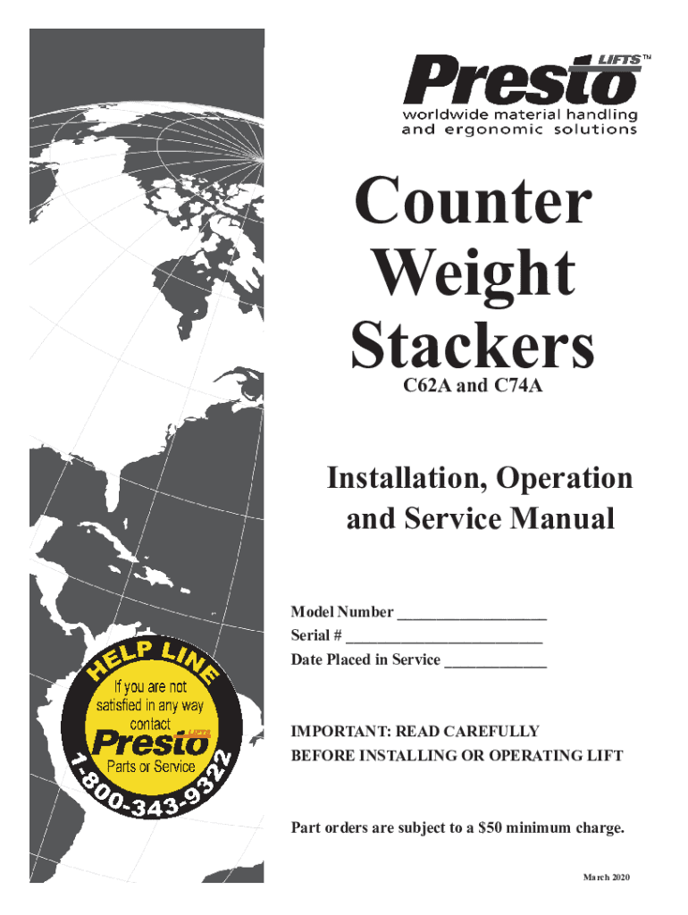 Counterweight Stackers C62A and C74AInstallation, Operation and Service Manual Model Number ___ Serial # ___ Date Placed in Service ___IMPORTANT: READ CAREFULLY BEFORE INSTALLING OR OPERATING Impart