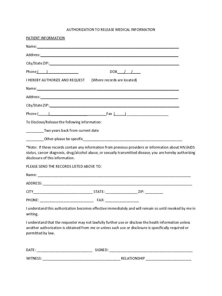 AUTHORIZATION TO RELEASE MEDICAL INFORMATION PATIENT INFORMATION Name: ___ Address: ___ City/State ZIP: ___ Phone (___) ___ I HEREBY AUTHORIZE AND REQUEST DOB ___//___(Where records are located)Name: