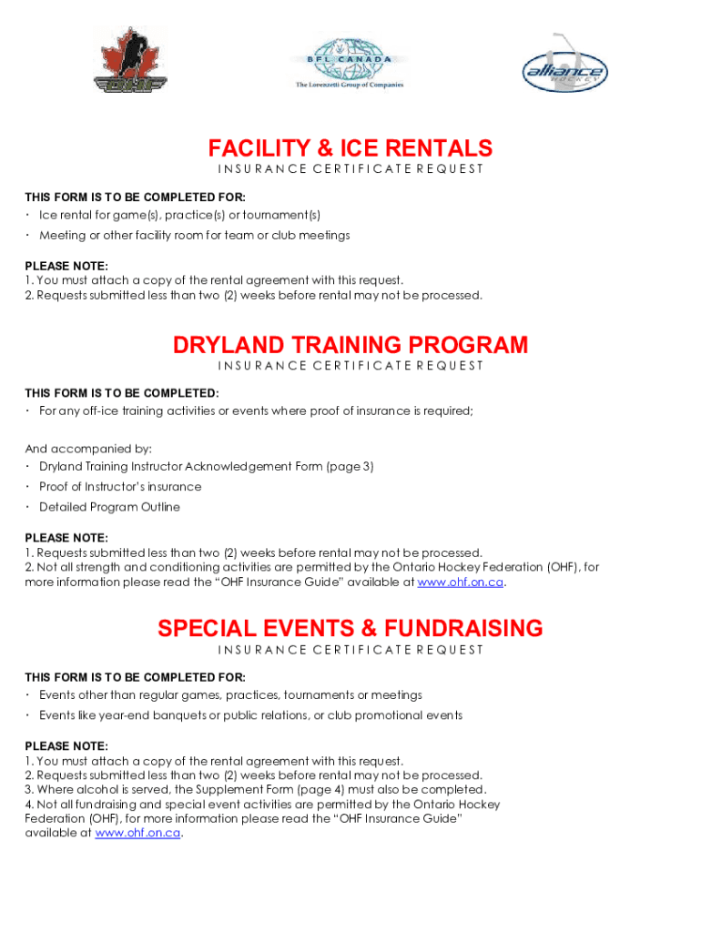 FACILITY & ICE RENTALS INSURANCE CERTIFICATE REQUEST THIS FORM IS TO BE COMPLETED FOR: Ice rental for game(s), practice(s) or tournament(s) Meeting or other facility room for team or club meetings