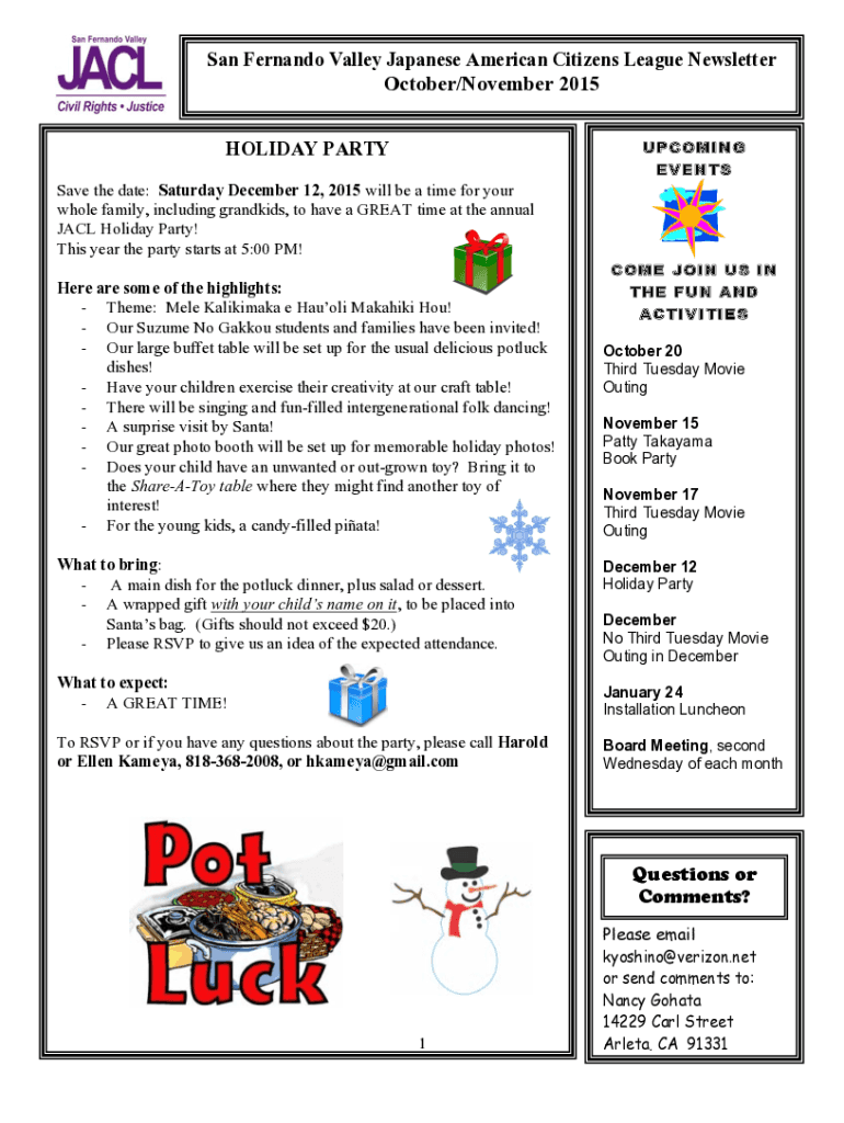 San Fernando Valley Japanese American Citizens League Newsletter October/November 2015 U PRO M IN G EVEN HOLIDAY PARTY Save the date: Saturday, December 12, 2015, will be a time for your whole family,