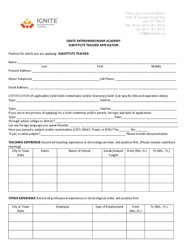 Heidi Long, Executive Director 1650 W Traverse Terrace Way Levi, UT 84043 Main Phone (801) 9018520 Fax (801) 9018515 info@igniteutah.org IGNITE ENTREPRENEURSHIP ACADEMY SUBSTITUTE TEACHER APPLICATION