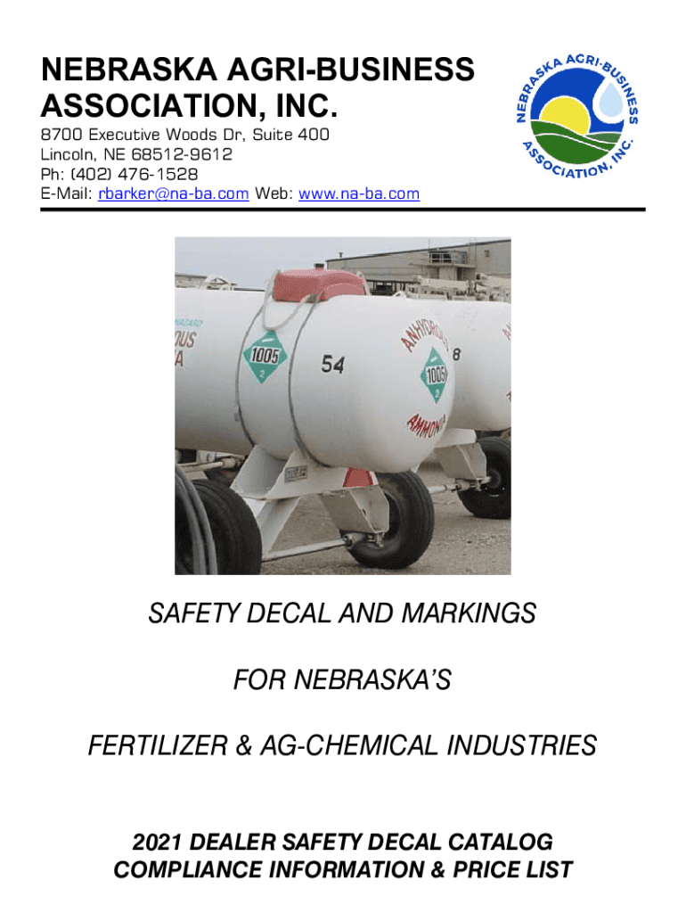 NEBRASKA AGRIBUSINESS ASSOCIATION, INC. 8700 Executive Woods Dr, Suite 400 Lincoln, NE 685129612 pH: (402) 4761528 Email: rbarker@naba.com Web: www.naba.comSAFETY DECAL AND MARKINGS FOR NEBRASKA FERTILIZER