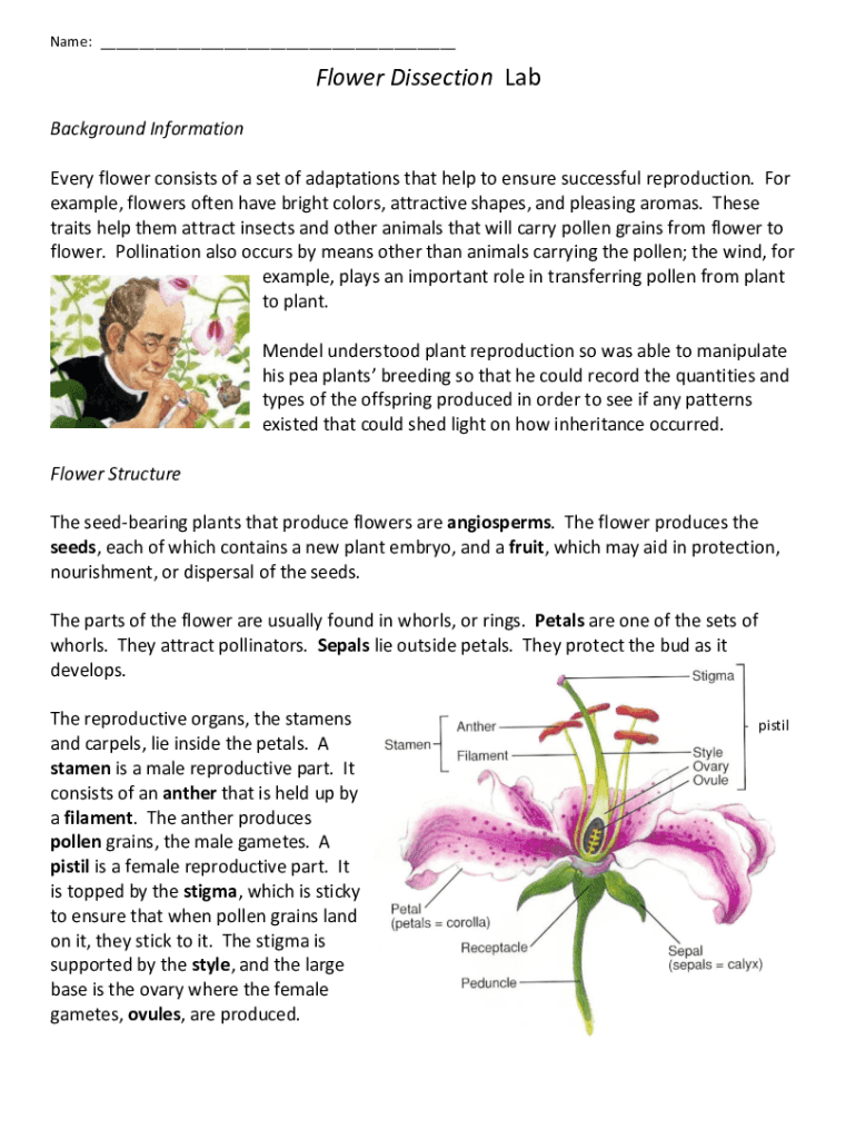 Name: ___Flower Dissection Lab Background Information Every flower consists of a set of adaptations that help to ensure successful reproduction. For example, flowers often have bright colors, attractive