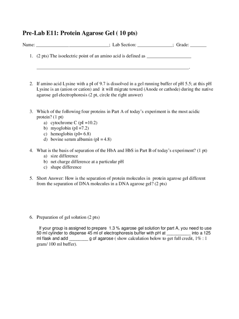 PreLab E11: Protein Agarose Gel (10 pts) Name: ___; Lab Section: ___; Grade: ___ 1. (2 pts) The Selectric point of an amino acid is defined as ___ ___.2. If amino acid Lysine with a pi of 9.7 is dissolved