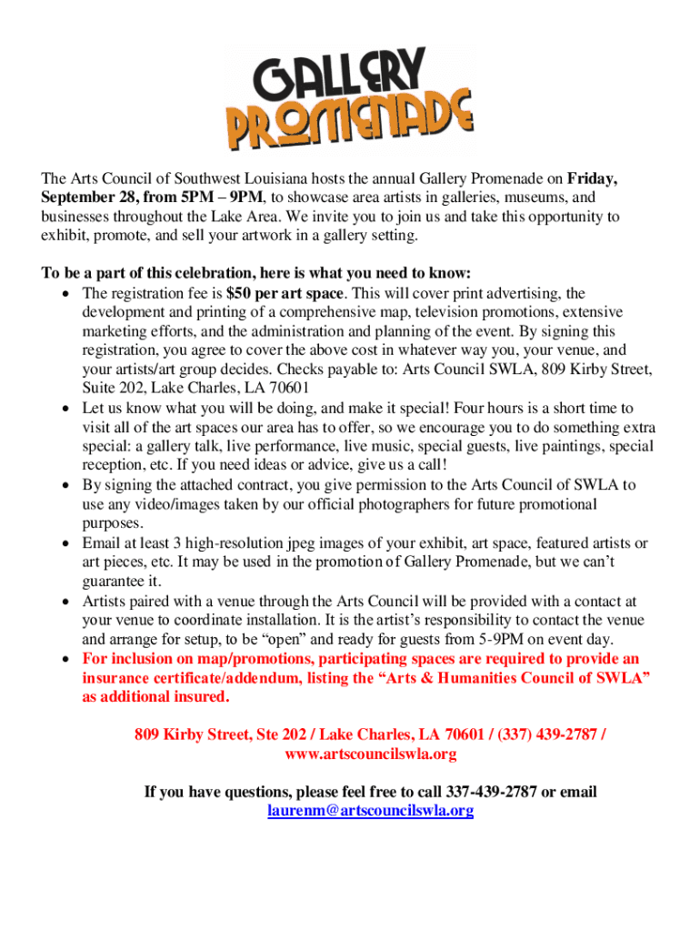 The Arts Council of Southwest Louisiana hosts the annual Gallery Promenade on Friday, September 28, from 5PM 9PM, to showcase area artists in galleries, museums, and businesses throughout the Lake