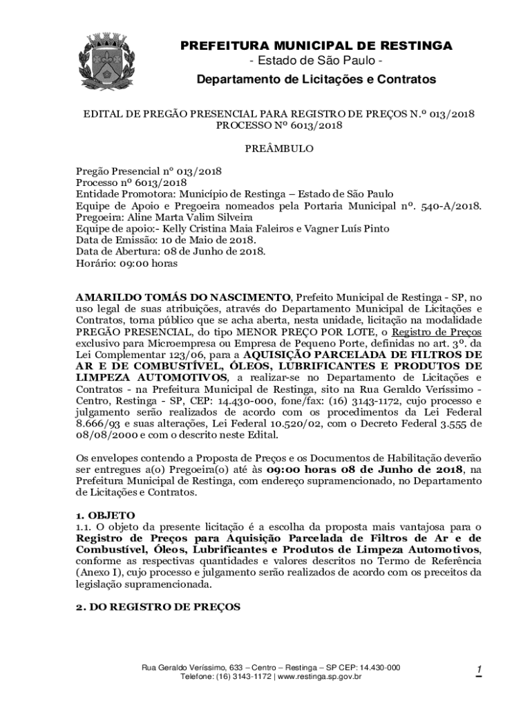 PREFECTURE MUNICIPAL DE RESTING Est ado de So Paulo Department de Licitaes e Contraltos EDIT AL DE PRESO PRESENCE PARA REGISTRY DE PRESS N. 013/2018 PROCESS N 6013/2018 PREMIUM PRESO Presence n 013/2018