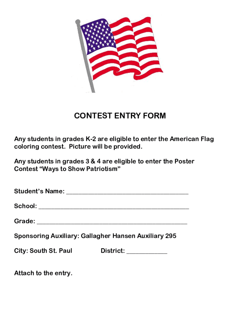CONTEST ENTRY FORM Any students in grades K2 are eligible to enter the American Flag coloring contest. Picture will be provided. Any students in grades 3 & 4 are eligible to enter the Poster Contest