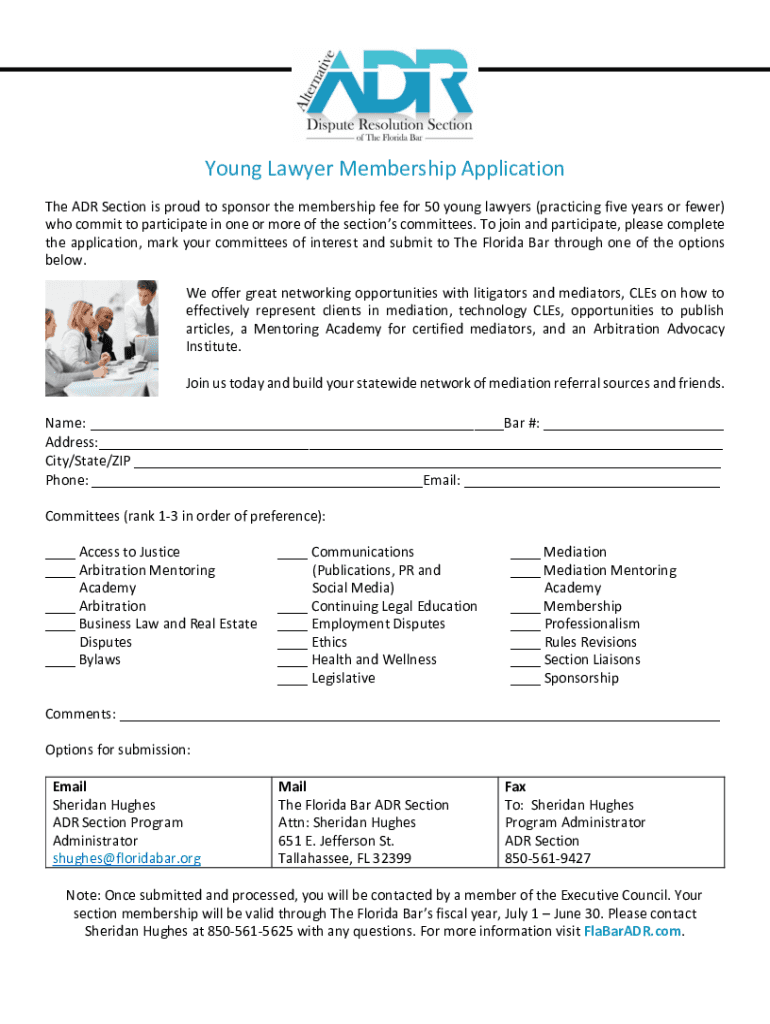 Young Lawyer Membership Application The ADR Section is proud to sponsor the membership fee for 50 young lawyers (practicing five years or fewer) who commit to participate in one or more of the sections