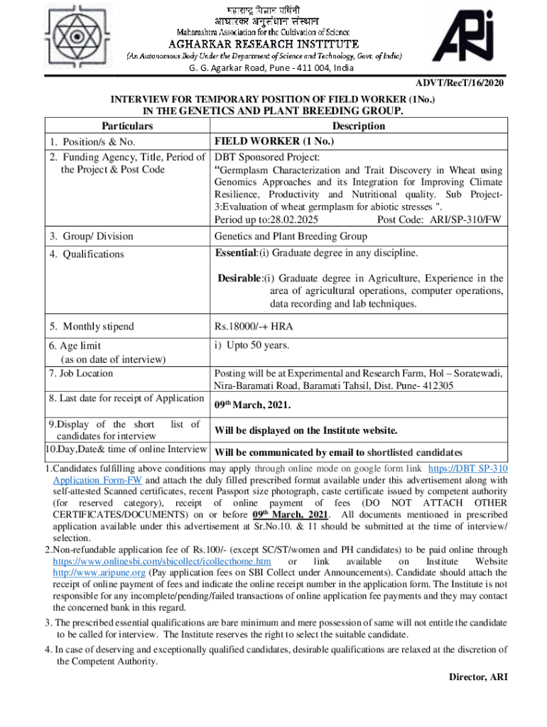 G. G. Agarwal Road, Pune 411 004, India ADVT/Rest/16/2020 INTERVIEW FOR TEMPORARY POSITION OF FIELD WORKER (1No.) IN THE GENETICS AND PLANT BREEDING GROUP. Particulars Description FIELD WORKER (1