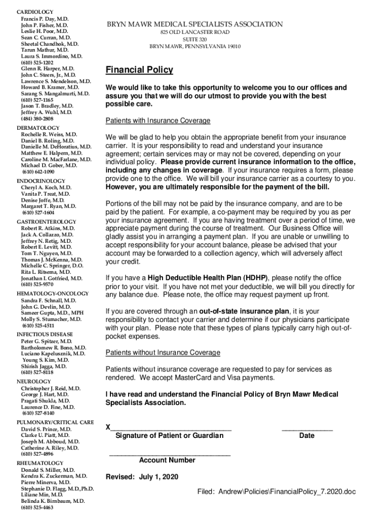 Healthcare providers and medical practitioners who are affiliated with Bryn Mawr Medical Specialists are required to file the necessary documentation.