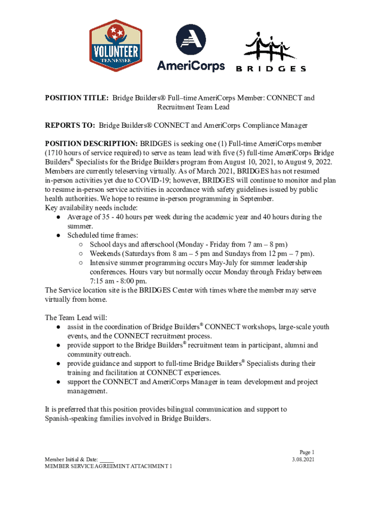 POSITION TITLE: Bridge Builders Full time AmeriCorps Member: CONNECT and Recruitment Team Lead REPORTS TO: Bridge Builders CONNECT and AmeriCorps Compliance Manager POSITION DESCRIPTION: BRIDGES is