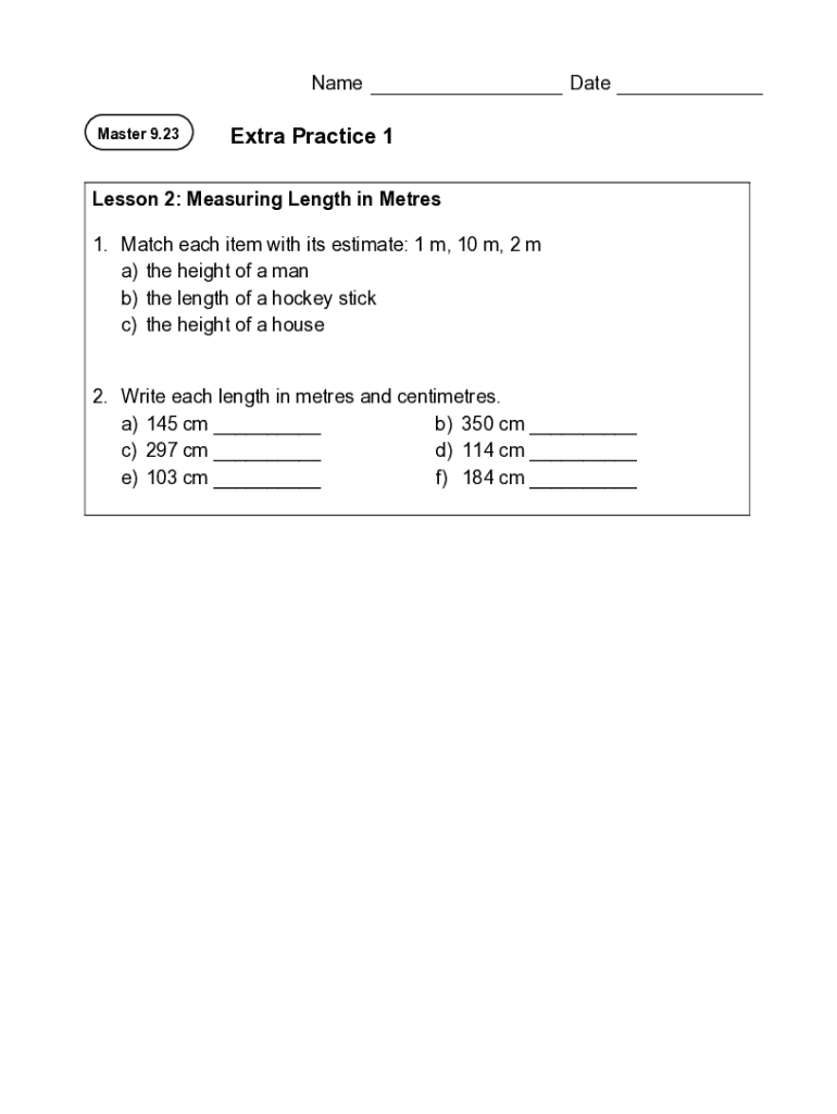Name Master 9.23DateExtra Practice 1Lesson 2: Measuring Length in Meters 1. Match each item with its estimate: 1 m, 10 m, 2 m a) the height of a man b) the length of a hockey stick c) the height of
