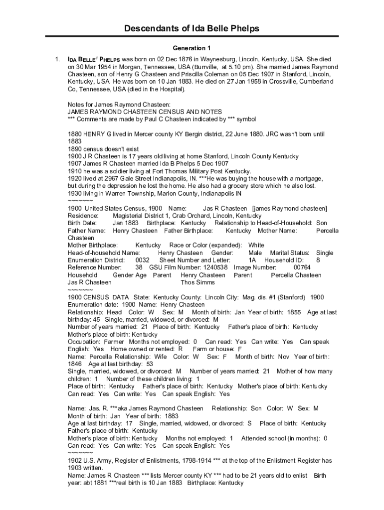 Descendants of Ida Belle Phelps Generation 1 1.IDA BELLE1 PHELPS was born on 02 Dec 1876 in Waynesboro, Lincoln, Kentucky, USA. She died on 30 Mar 1954 in Morgan, Tennessee, USA (Burrill, at 5.10