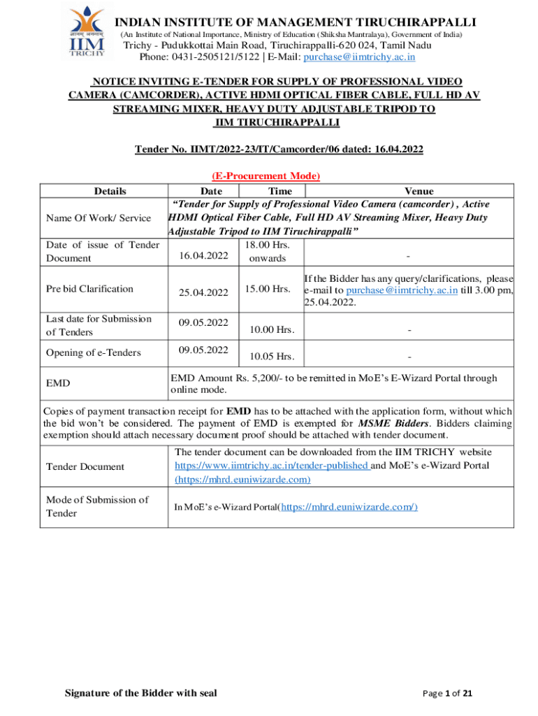 Get the free NOTICE INVITING E-TENDER FOR SUPPLY OF PROFESSIONAL VIDEO